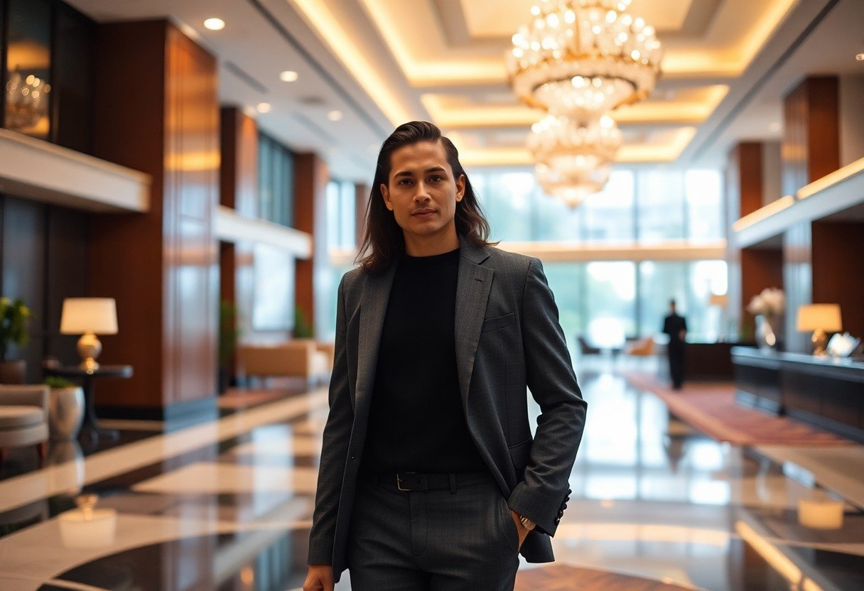 Confident businessman in stylish suit standing in luxury hotel lobby
